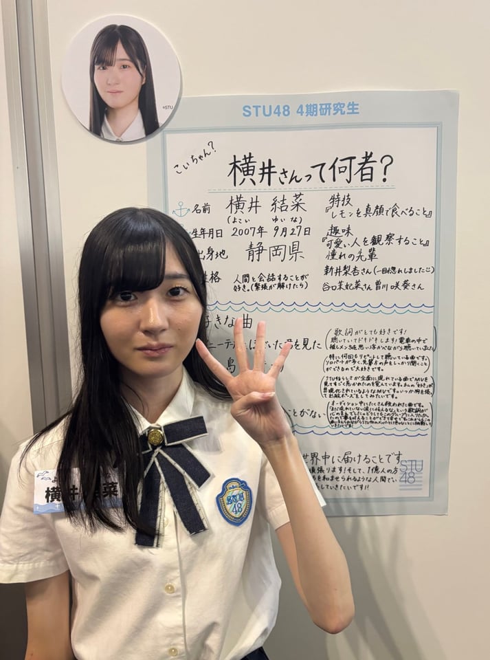 初めての握手会、とてもドキドキしています。会いに来てくださる方を自分の言葉で笑顔にできるよう、お一人おひとりとしっかり向き合いたいです。私のPRポイントは、ゆったりとした話し方です。みなさんに安心していただけるような、心地良い時間を作りたいと思っています。短い時間でも“横井さんと会えてよかった”とみなさんに思っていただけるよう、精一杯頑張ります。よろしくお願いします。