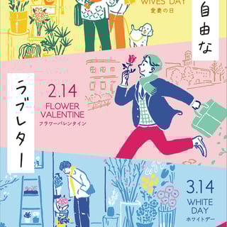 世界におけるバレンタインデーは“大切な人同士がお互いに愛や感謝の気持ちを伝えあう日”として、花を贈ることがポピュラーです。実は2月14日は“世界でいちばん花を贈る日”でもある。“フラワーバレンタイン”とは、こうしたバレンタインデーの素敵な風習にならい、大切な人に愛や感謝の気持ちをこめて花を贈るきっかけを作り、花贈りを応援するプロモーション。さらに、バレンタインデー前後の1月31日「愛妻の日」、3月14日「ホワイトデー」を含め“3LOVE STORIES”と表現し、1月~3月には花贈りのチャンスが3回あることを全国の花店からお客へアピールしている。なお、フラワーバレンタインのビジュアルは、花を片手に相手の喜ぶ笑顔を想像しながら弾むような足取りで歩く様子をイラスト化、花を贈る際のウキウキワクワクする気持ちを表したもの(イラスト:MIMOE)。