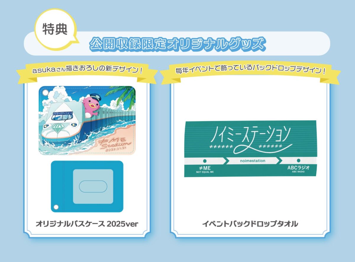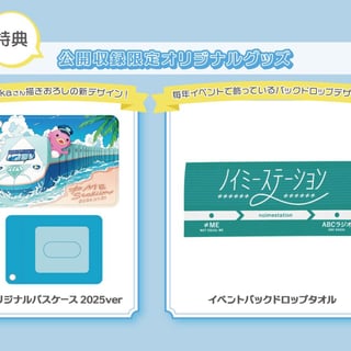 チケットは一般チケットと特典付チケットの2種類。今年の特典は、番組でお馴染みのイラストレーター・asukaがデザインしたパスケース&毎年イベントで使用しているバックドロップ仕様のタオル。