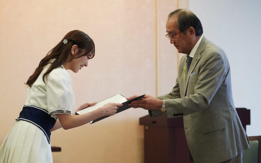 広島市役所で行なわれた『平和文化アンバサダー委嘱式』には、石田千穂・久留島優果・中村舞の3名が出席。松井一實広島市長より正式に委嘱状が授与された。