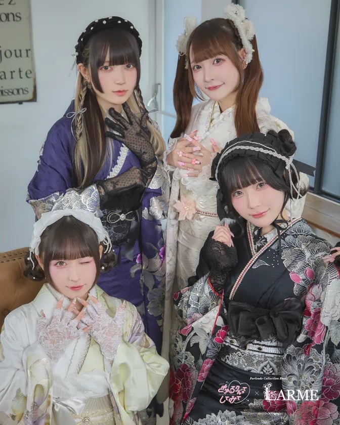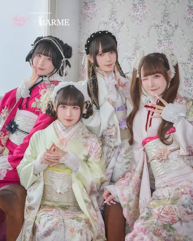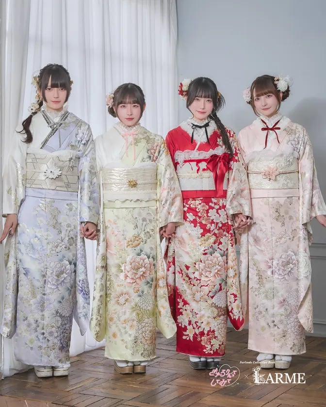 本コレクションでは、伝統的な振袖に現代のトレンドを融合させた新しいスタイルを提案。モデルには、独自の感性で熱狂的な支持を集めるアイドルグループ・きゅるりんってしてみてを迎え、雑誌『LARME』が創り出す“甘くて、かわいい”世界観を表現した。