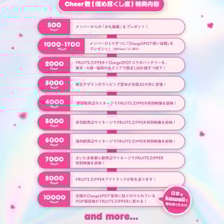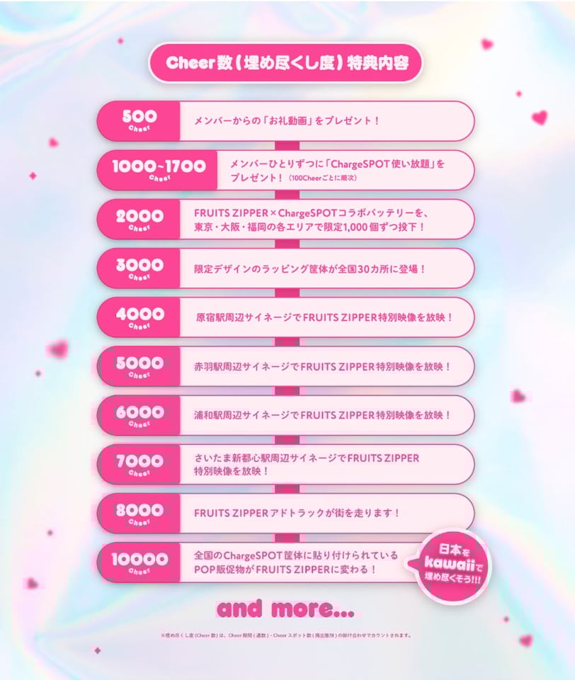 ・1000〜1700 Cheer達成:FRUITS ZIPPERメンバー1人ずつに「ChargeSPOT 使い放題」をプレゼント(100Cheerごとに順次)。
