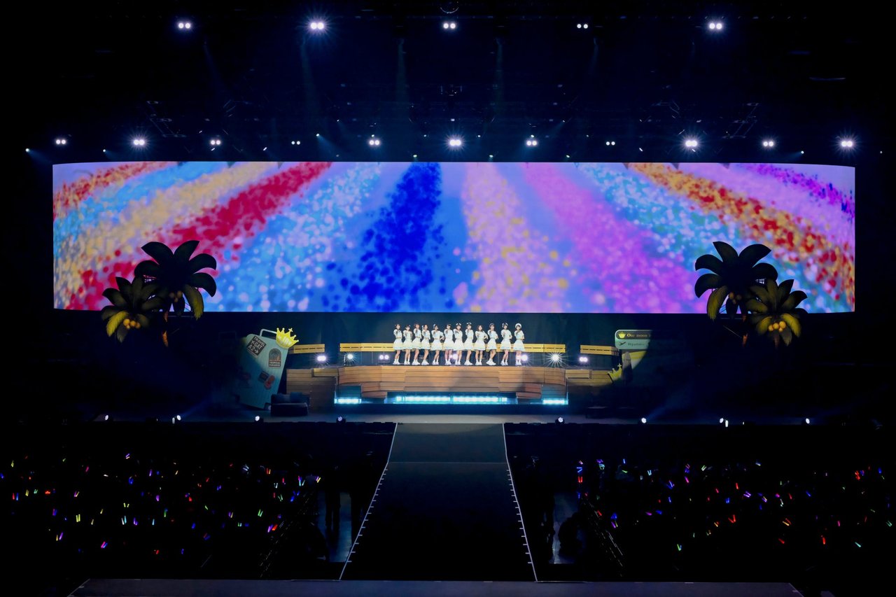 その後も先輩グループのカバーを盛り込みつつ、華やかな“空の旅”を経て南の島へ着いた≒JOY。彼女たちは「ブルーハワイレモン」などのサマーチューンを連発して会場を爽やかな空気で満たし、ラストスパートでは「体育館ディスコ」「初恋シンデレラ」などの鉄板曲を畳みかけた。そして小澤が“メンバーみんなで試行錯誤して、挑戦できたツアーだったんじゃないかなと思います!”とツアーを振り返り、今後の活動への意気込みを述べたあとは「ネバギバ!生きろ」のパフォーマンスへ。ファンに宛てたメッセージが映し出されるスクリーンを背に、メンバーは晴れやかな歌声を響かせた。