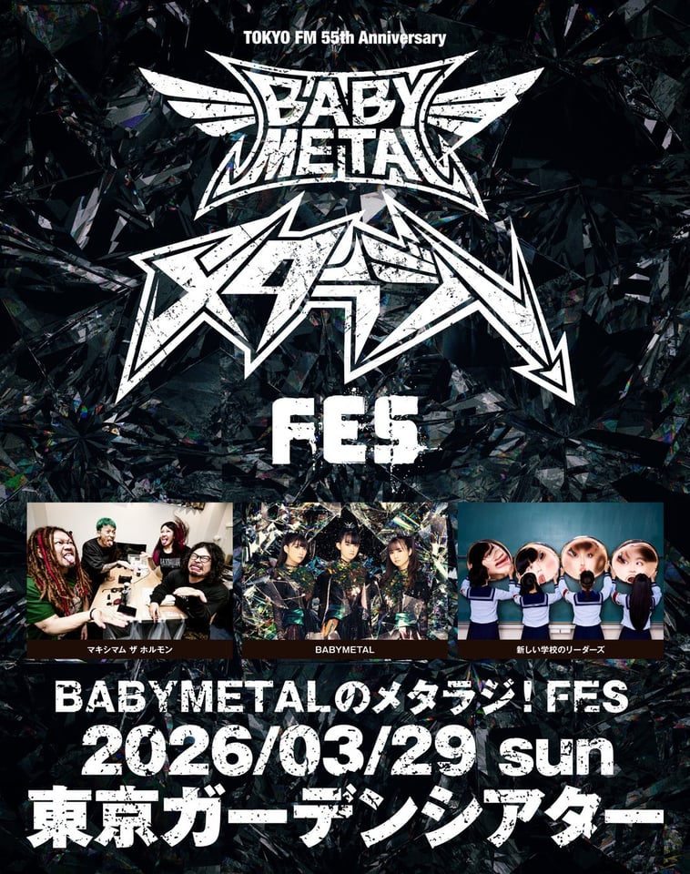 TOKYO FMで毎週土曜19:30から放送中のBABYMETALがパーソナリティを務める『BABYMETALのメタラジ!』が、2026年3月29日(日)に東京ガーデンシアターにて、番組初イベント『TOKYO FM開局55周年記念 BABYMETALのメタラジ!FES』を開催することが決定。出演はBABYMETAL、マキシマム ザ ホルモン、新しい学校のリーダーズ。チケットは12月6日(土)20:00~最速先行を実施(販売期間は、12月14日(日)23:59分まで)。