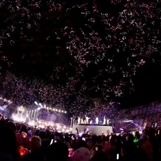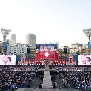 開演時間を迎えると、球場のスタンド席に立ち、「青春”サブリミナル”」を歌うメンバーの姿がスクリーンに映し出される。そして、この曲でセンターを務める髙松瞳が会場後方のサブステージに姿を現し、映像とリンクするように一節を歌い上げたのち「Overture」が鳴り響いた。髙松の“ハマスタ行くぞ!”という気合いのひと言を合図に、「青春”サブリミナル”」のパフォーマンスがスタート。チェック柄とフリルが印象的な新衣装に身を包んだメンバーは、上昇するセンターステージの上から晴れやかな歌声を届けた。また「超特急逃走中」ではトロッコで場内を巡ったほか、クレーンに乗って観客へ手を振りながら笑顔を振りまいた。