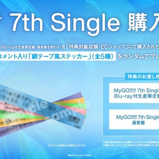 MyGO!!!!! 7thシングル(Blu-ray付生産限定盤・通常盤を問わず)を特典配布対象店舗・ECショップにて1枚購入ごとに先着で、キャラクター複製コメント入り「銀テープ風ステッカー」(全5種)をランダムでプレゼント。