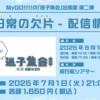 8月16日(土)に飛行船シアターにて開催される『MyGO!!!!!「迷子集会」出張版 第二弾 -日常の欠片-』の配信が決定。
