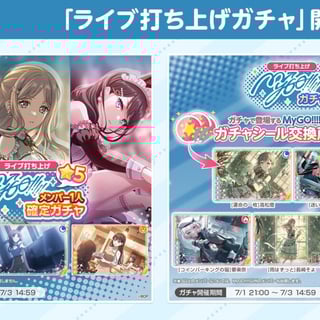 本ライブ開催を記念して、『ライブ打ち上げガチャ』が開催中。MyGO!!!!!メンバーの出現率がアップするほか、さまざまなアイテムと交換できるピース付きとなる。さらに、有償スター限定の★5 MyGO!!!!!メンバー1人確定ガチャも同時開催中。