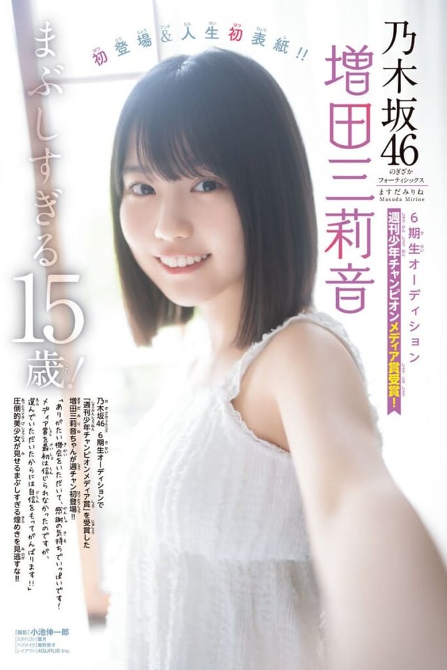 乃木坂46の6期生オーディションで「週刊少年チャンピオンメディア賞」を受賞した増田三莉音。『週刊少年チャンピオン』初登場&人生初ソロ表紙となった今回は、真っ白のルームウェアに身を包んで大好きなコーヒーゼリーを食べる姿から、シャツワンピを着て特技の片手卵割りに臨む姿、制服を着て弾ける笑顔を見せる姿を披露。