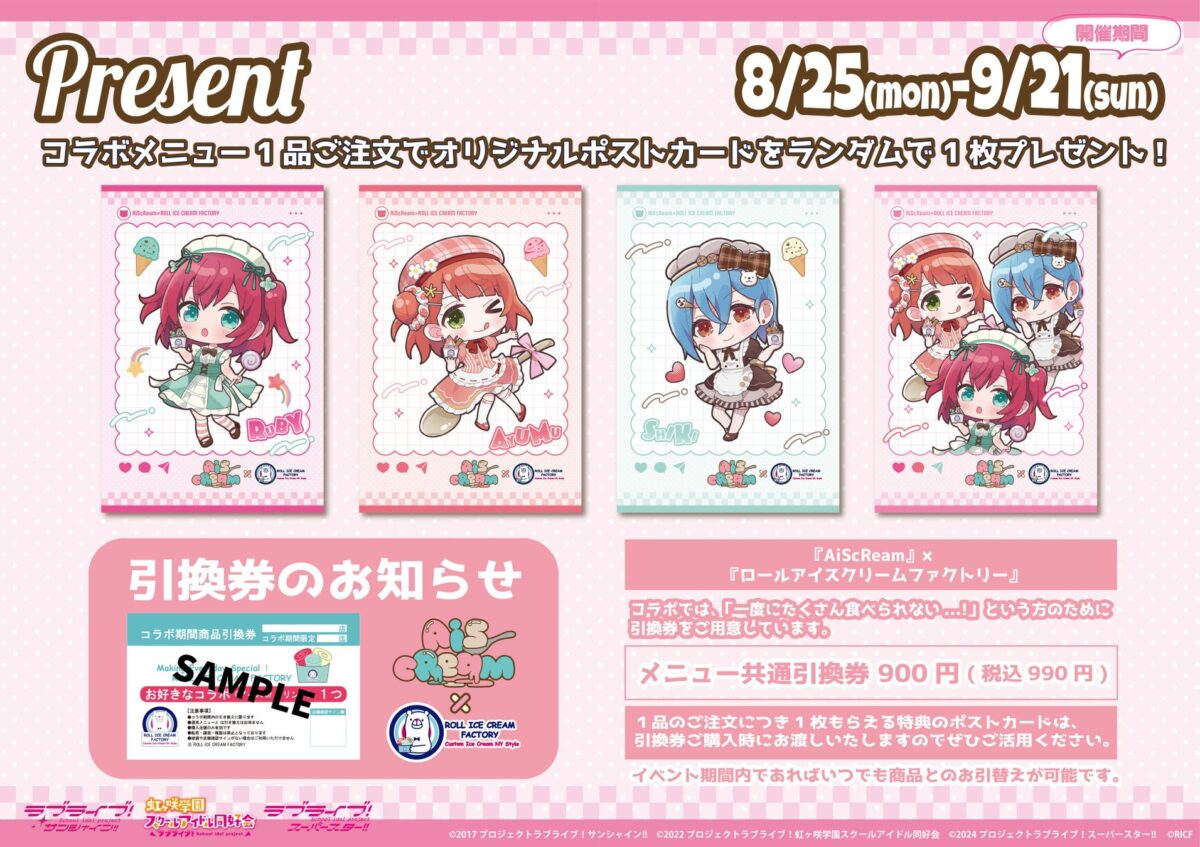 ロールアイス専門店『ロールアイスクリームファクトリー』(ROLL ICE CREAM FACTORY)が、ラブライブ!シリーズ初の作品横断ユニット『AiScReam(アイスクリーム)』との初のアイスクリームコラボを、8月25日(月)より全国の対象3店舗にて開催する。