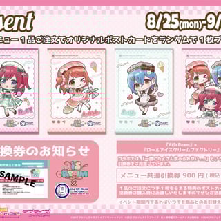 対象のコラボメニュー(アイスまたはドリンク)を1品購入ごとに、描き下ろしビジュアルを使用したオリジナルポストカード(全4種/ランダム)を1枚プレゼント。