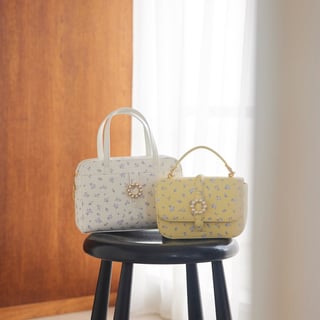 オフホワイトをベースにブルーの小花柄が目を引く新作シリーズ。中央のパールは、花のようにセッティングし、傷がつきにくい絞感のある上質な合成皮革を使用。