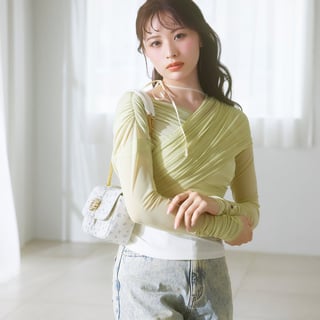 パステルイエローのトップスとデニムに合わせることで、春先取りのコーディネートに。