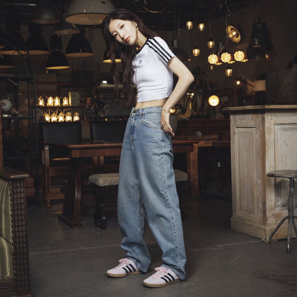 スリーストライプスが印象的なショート丈の「BABY TEE」に、ワイドデニムを合わせたラフなスタイル。古着とマッチするピンクの「STADT」が、足元からナチュラルなこだわりをにじませる。