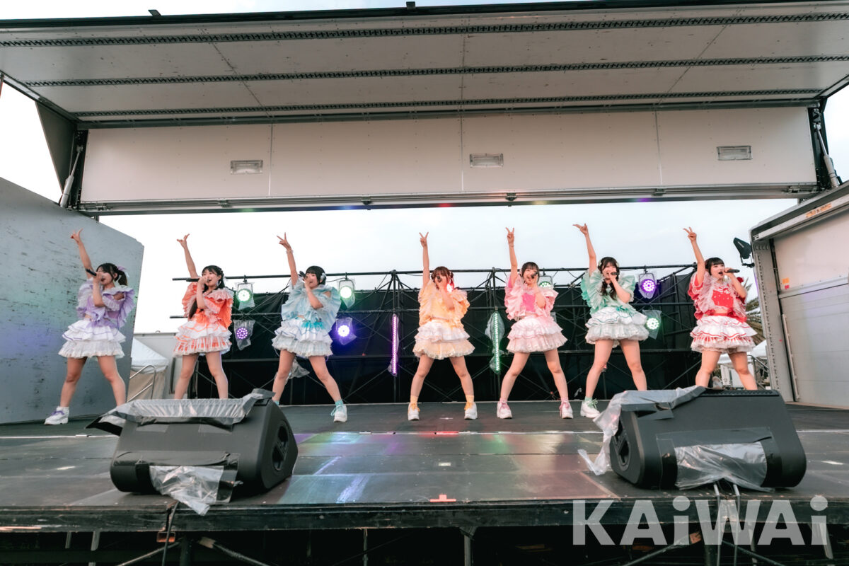7人の輝く笑顔が印象的なステージングと、グループ名どおりのハッピーなエネルギーが夏フェスの夕暮れに映え、観客の心に深い印象を残した。