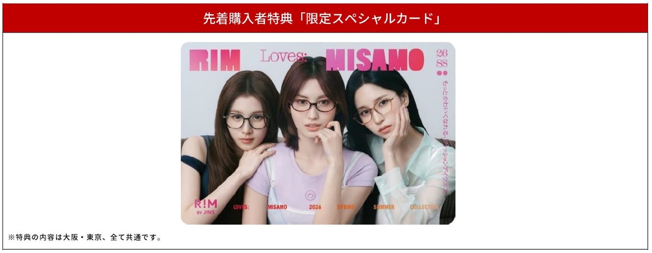 ファッションアイウエアを提案するJINSの姉妹ブランド『RIM(リム)』が、TWICEの日本人メンバーMINA、SANA、MOMOからなる3人組ユニット・MISAMOをブランドアンバサダーに起用したことを記念して、期間限定ストア『RIM loves MISAMO POP-UP STORE』を大阪と東京の2都市でオープン。大阪は2026年4月24日(金)~ 5月24日(日)ルクア イーレにて、東京は2026年5月1日(金)~ 5月20日(水)渋谷スクランブルスクエアにて開催する。
