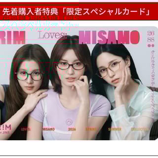 お気に入りのアイウエアを見つけた後も、楽しい企画を用意。期間限定ストアにてアイウエアまたはサングラスを購入した人に先着で、プロモーションキービジュアルを使用した特別なスペシャルカード(1枚)をプレゼント。さらに、ストアでのお買い物1会計につき1回、「ハズレなしRIMくじ」に挑戦できる。景品には、次の買い物で使える、税込10,000円分のアイウエアプレゼントチケットや、MISAMOの撮影の裏側(Behind the Scenes)を収めた、ここでしか手に入らないスペシャルビジュアルカードなど、ファン必見の豪華な特典の数々をラインナップ。キャンペーンは大阪・ルクア イーレ店が4月24日(金)、東京・渋谷スクランブルスクエアが5月1日(金)にスタートし、なくなり次第終了となる。詳細は特設サイトにて確認を。