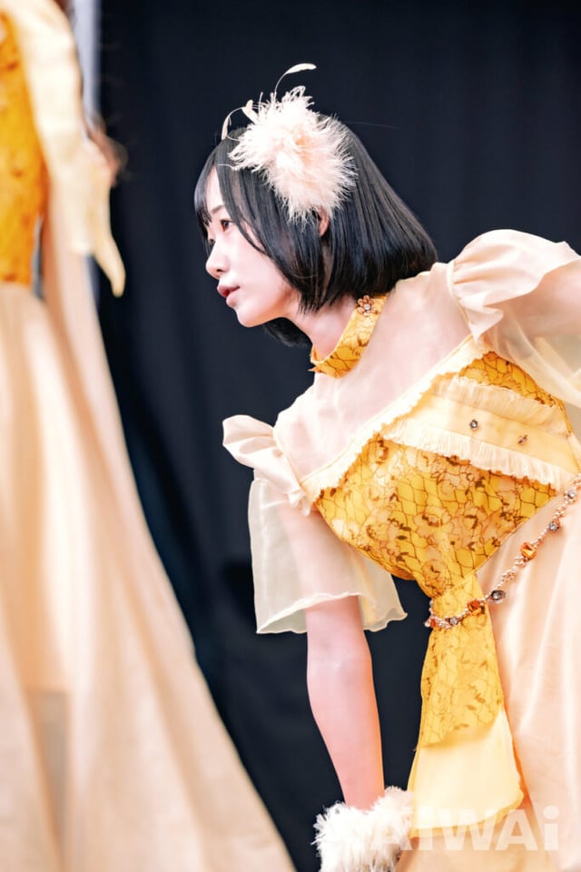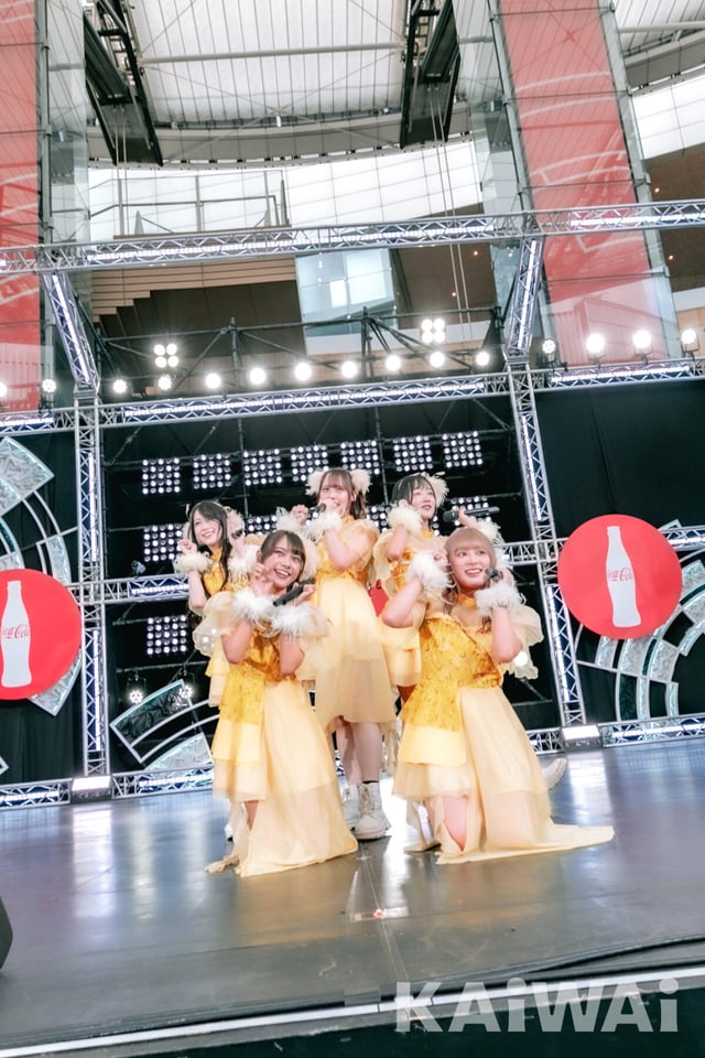 熱気冷めやらぬ間に「六感」へ。齋藤ザーラチャヒヨニのキュートな歌声で始まり、黄色の衣装でひらりとステージを舞う5人は妖精感がある。間奏“1、2、3、4、5、6”の新間の“5、6”の声には妙な色気もある。“六本木! 六本木!”と煽り、曲繋ぎで「八月」がスタート。佐佐木一心のソリッドな歌声とクラップを促す煽りは元気が出るし、大白桃子の穏やかな歌声には癒される。