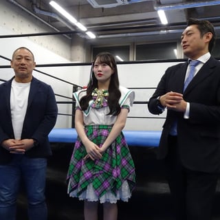 川松 ぜひみなさん注目していただきたいなと思いますけど、行き当たり上、私が総合プロデューサーという役を引き受けることになりまして。髙木さんと連日準備してますけど、リングの上でパフォーマンスってどういうことかということで、今日はマレーシアから緊急来日してこちらにKLP48の山根涼羽さんがお越しいただくことになりましたので、山根さんをお迎えしたいと思います。どうぞ!