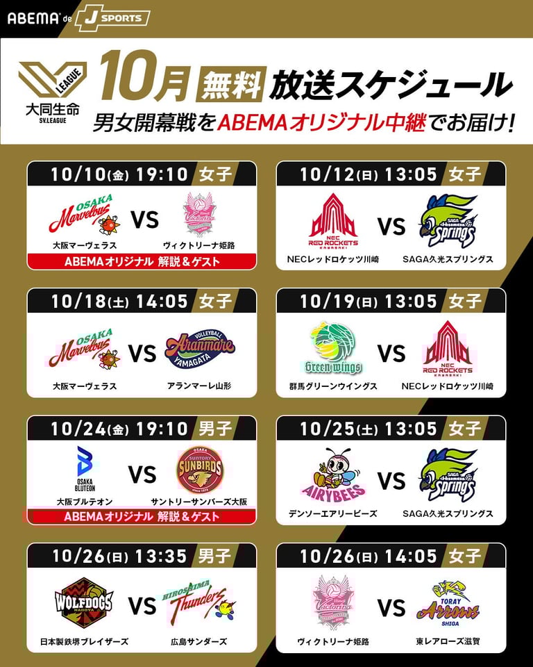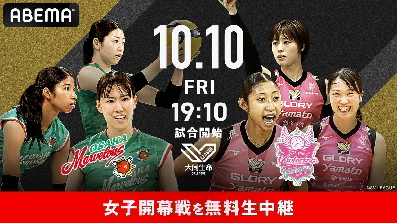 ABEMA「ABEMA de J SPORTS」が、10月10日(金)に開幕する『2025-26 大同生命SV.LEAGUE WOMEN』(以下、SVリーグ女子)より『大阪マーヴェラスvsヴィクトリーナ姫路』の模様を、18:40より無料生中継する。