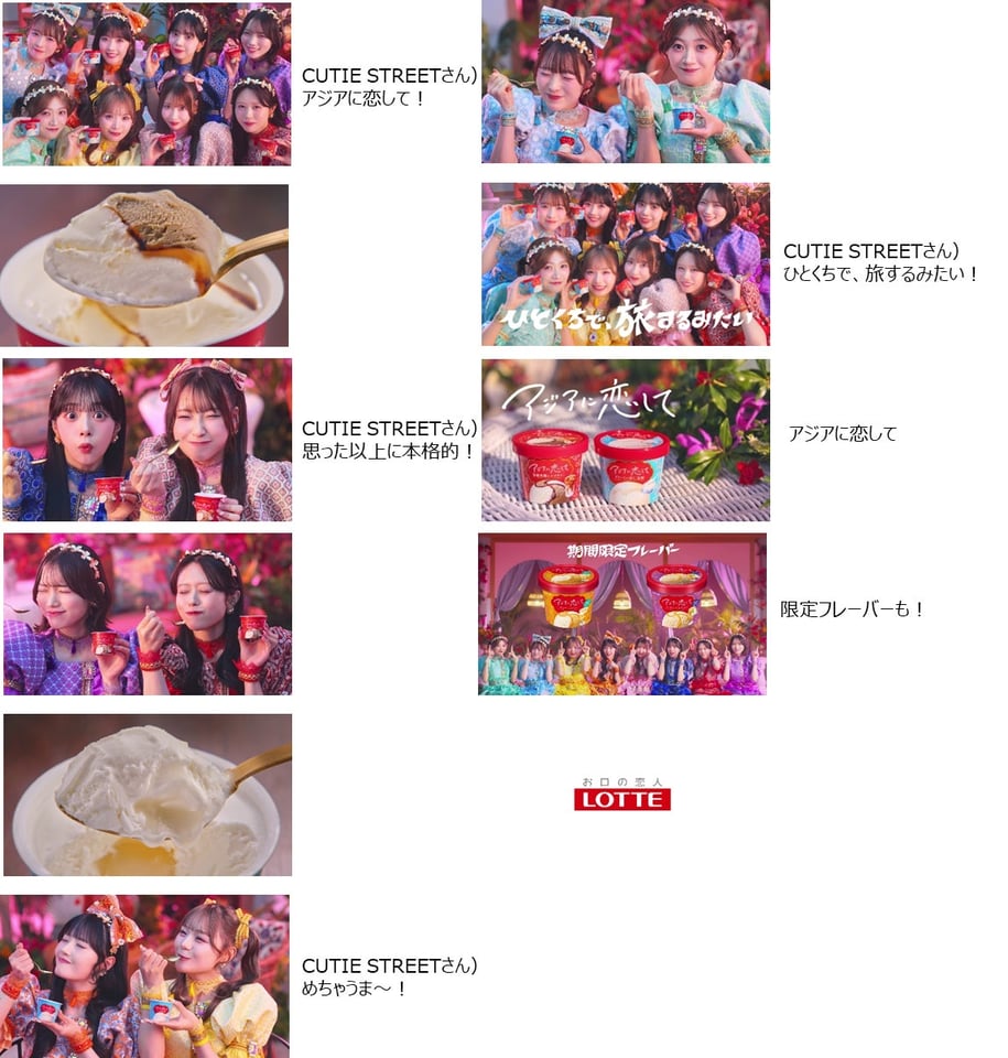 4月6日(月)より、ロッテのアイスカテゴリーにおいて10年ぶりとなる待望の完全新ブランド「アジアに恋して」シリーズの発売がスタート。それに伴いCUTIE STREETが出演する新TV-CM「ひとくちで、旅するみたい篇」が4月6日(月)より全国(一部の地域を除く)で放送を開始。また本TV-CMの撮影の裏側が観られるスペシャルムービーもYouTubeにて同時公開される。
