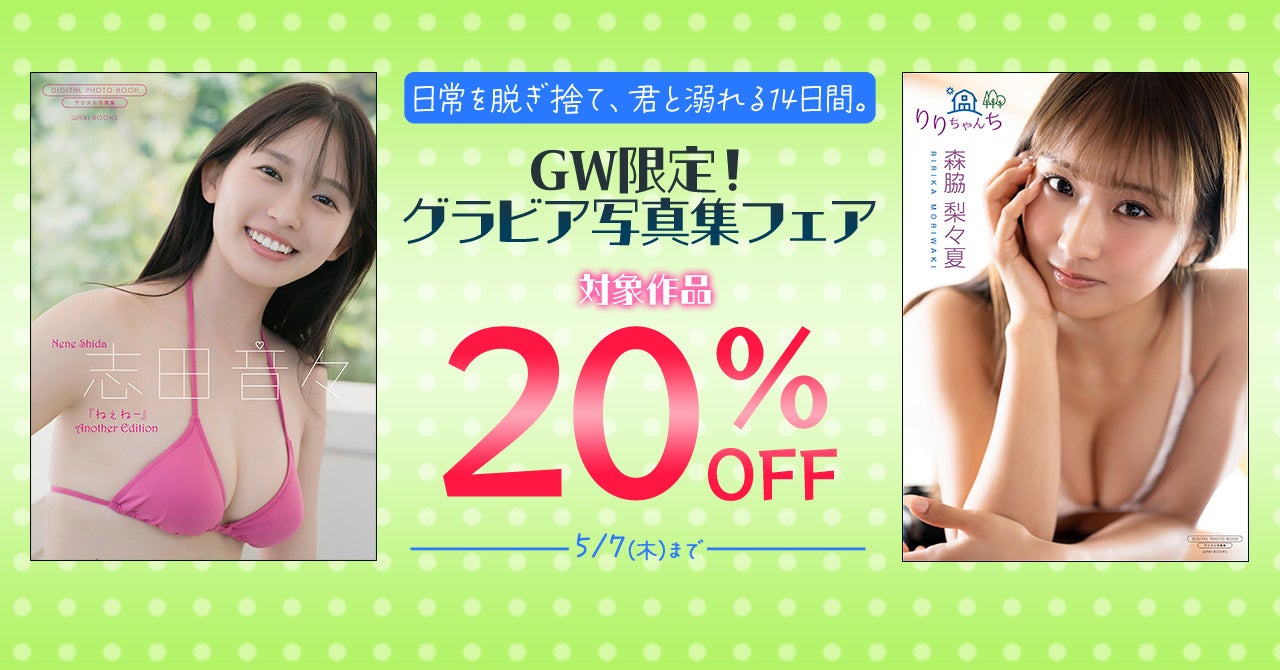 対象作品は、俳優・グラビアなど幅広く活躍する志田音々のセカンド写真集『ねぇね~』や未公開カットで構成したデジタル写真集『ねぇね~ - Another Edition -』、“ピュアすぎる”で話題となった森脇梨々夏のデジタル写真集『りりちゃんち』など、合計20作品をラインナップ。ぜひたくさんの作品に触れてみてほしい。