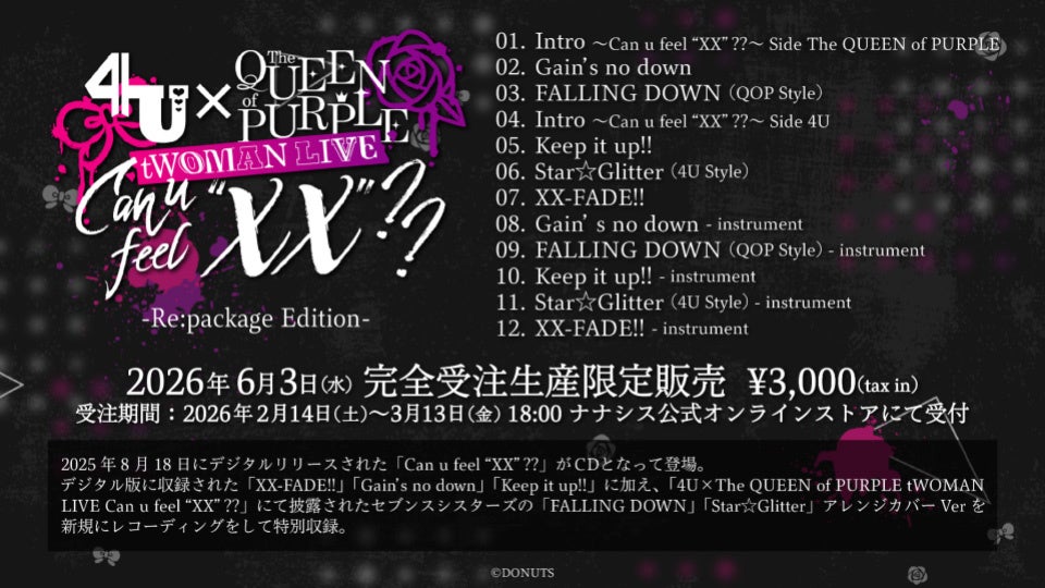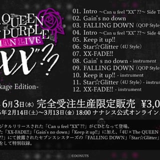 2025年8月に開催された4U、The QUEEN of PURPLEの対バンライブ<4U×The QUEEN of PURPLE tWOMAN LIVE Can u feel XX??>で披露された新曲「Gain's no down」、「XX-FADE!!」、「Keep it up!!」、およびカバー楽曲「FALLING DOWN」、「Star☆Glitter」を収録したCDの発売が決定。現在ナナシスオフィシャルストアにて予約受付中。