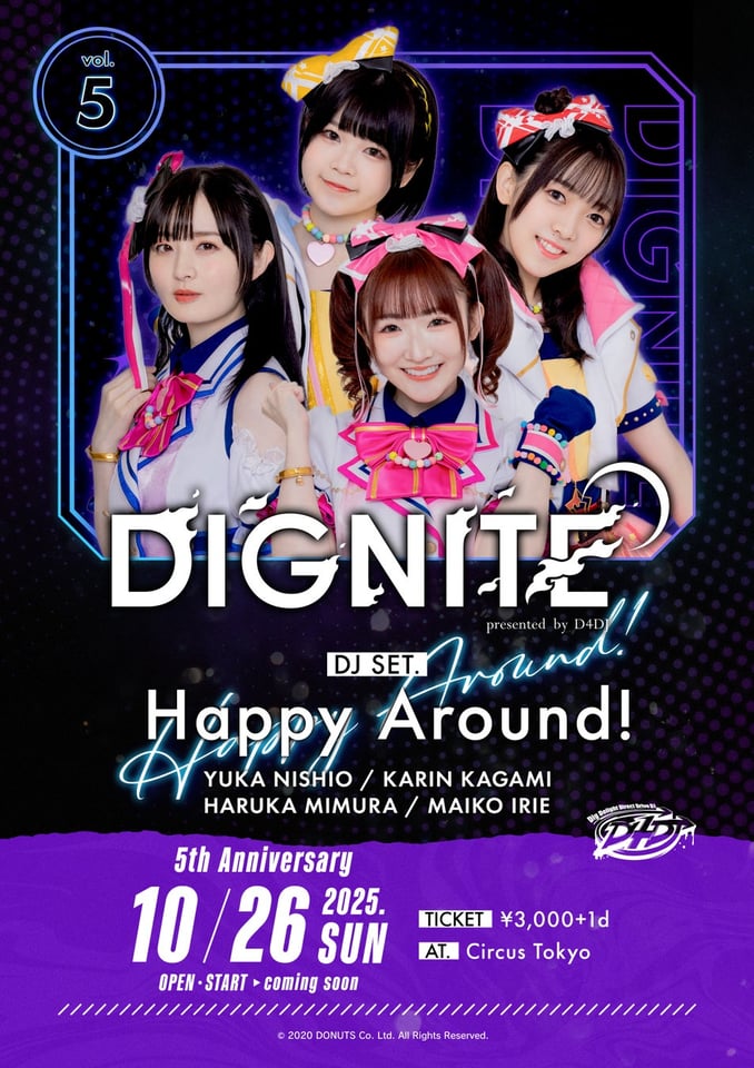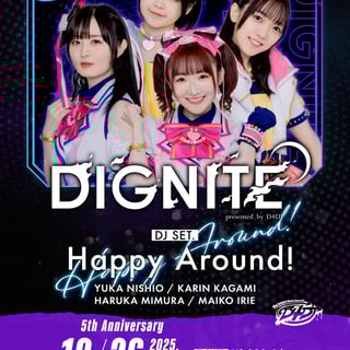 Happy Around!から西尾夕香(愛本りんく役)、各務華梨(明石真秀役)、三村遙佳(大鳴門むに)、入江麻衣子(渡月麗役)の4名が出演し、公開生放送『水曜日のD4DJ』、DJイベント『DIGNITE』を実施する。