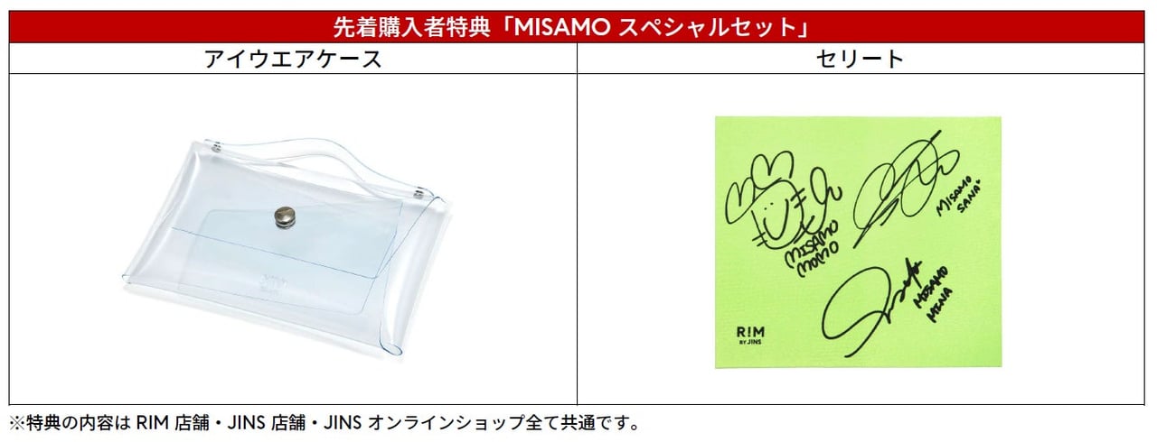さらに、RIM全店舗とJINSの一部店舗、JINSオンラインショップにて、MISAMOがコンセプトフィルムで着用した対象商品を購入した人に先着で、オリジナルのアイウエアケースとセリートをプレゼントする<RIM loves MISAMO MUST BUY CAMPAIGN>を開始する。