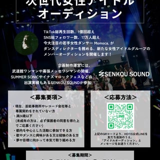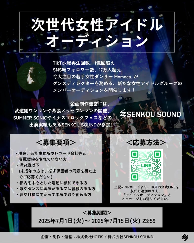 HOTIS公式LINEを友だち追加のうえ、「アイドルオーディション」とメッセージをお送りください。