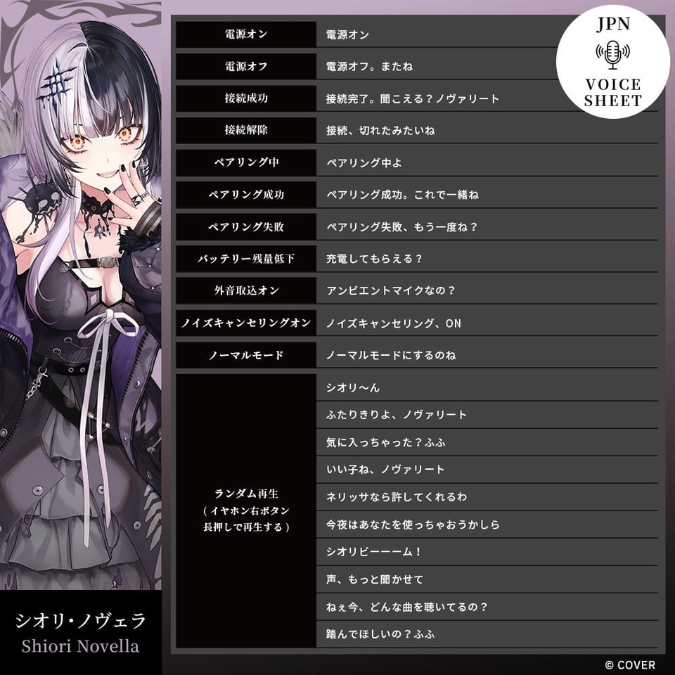各タレントごとのモードと、シオリ・ノヴェラ&古石ビジュー&ネリッサ・レイヴンクロフトとFUWAMOCOの掛け合いモードを、それぞれ“日本語/English”で搭載。14モード、計370種以上の完全新録ボイスを楽しめる。チャージングケースとイヤホン本体はホロライブEnglish -Advent-をイメージした特別仕様。