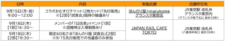 ①9月15日(月・祝)9:00~12:00に「ほんのり屋×marukome グランスタ東京店」にて先行販売する「コラボおむすびチケット A・B 2枚セット」 2,960円(税込)を購入ください。