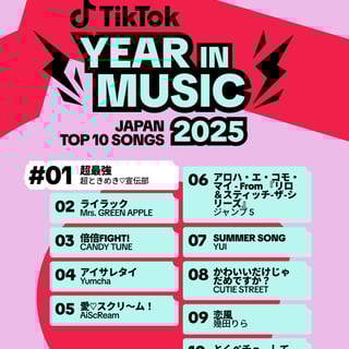 ショートムービープラットフォーム『TikTok』が、2025年にTikTokで最も人気を集めたアーティストや楽曲、音楽トレンドを選出する『TikTok Year in Music 2025』をグローバルで発表。2025年に日本で最も人気を集めた楽曲を選出する『TOP SONG JAPAN 2025』は、超ときめき♡宣伝部の「超最強」に決定した。