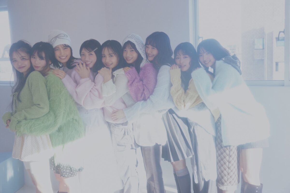 2ポーズ目は、綺麗色ニットを着こなし初の9人全員で撮影。エモい表情たっぷりなソロカットも注目ポイントに。
