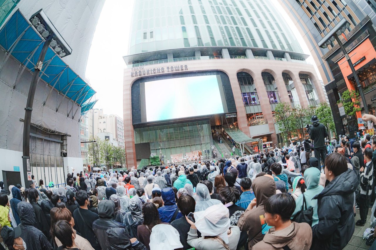 大雨の中、広場を埋め尽くすほどのファンが集結し、歌舞伎町が熱気で包まれた。