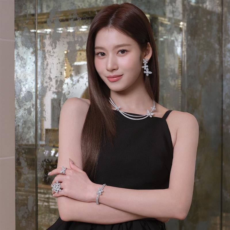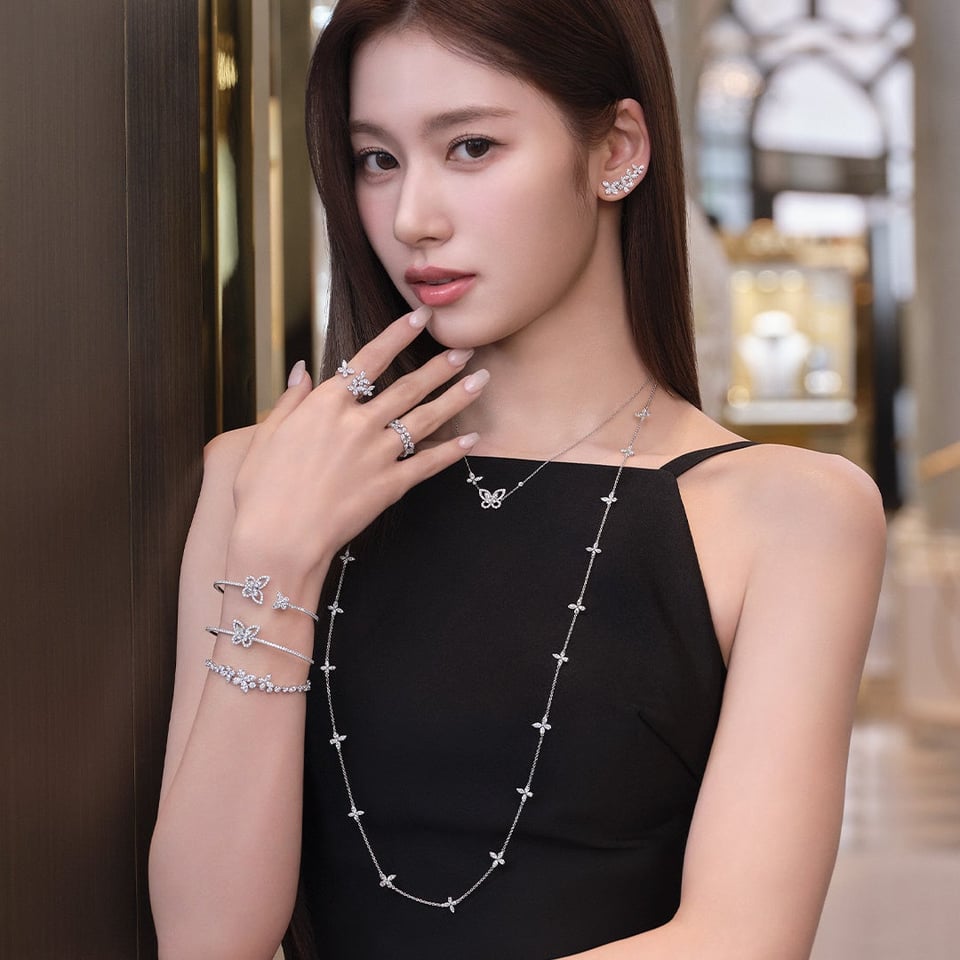 パヴェ バタフライにフォーカスしたルックのSANAは、可憐な美しさを放つパヴェ バタフライ コレクションのネックレス、イヤリング、ブレスレット、リングに身を包み、いずれのアイテムもシングルまたはトリプルにセットされた煌めくグラフ バタフライがあしらわれている。それぞれの羽には、光り輝くラウンド パヴェ ダイヤモンドが隙間なく敷き詰められ、センターはオーバルシェイプ、またはマーキスカットのダイヤモンドが抱かれた優美なデザインとなっている。