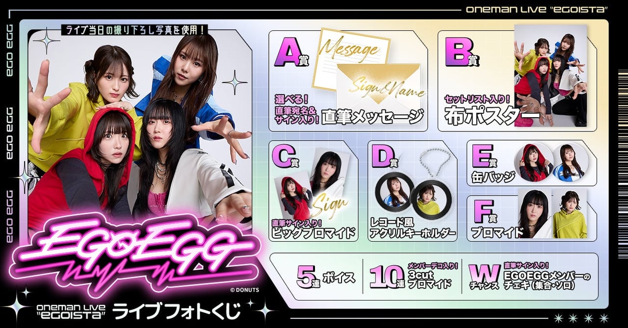 EGOEGGのラッフルくじ「ONEMAN LIVE ”EGOISTA”ライブフォトくじ」」が実施決定。同ライブ撮り下ろしのブロマイドなどがラインナップ。詳細は特設ページにて。