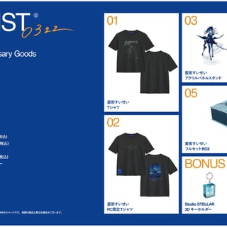 HOSHIMACHI SUISEI ONLINE STOREにて、誕生日と活動8周年を記念したアニバーサリーグッズを販売中。星街すいせい自身がこだわったデザインのTシャツ、ステッカーセット、アクリルスタンドに加え、4点フルセットも用意。今年は公式ファンクラブ限定デザインのTシャツも展開。