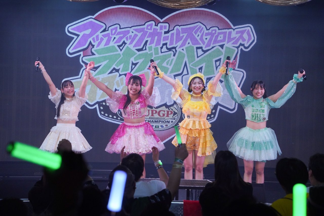 アイドルとプロレスの二刀流で活躍するアップアップガールズ(プロレス)(以下、アプガ(プロレス))は、らく、渡辺未詩、鈴木志乃、高見汐珠からなる4人組グループ。プロレスラーとして東京女子プロレスを主戦場にする彼女たちは、アジア、アメリカ、ヨーロッパと世界規模で試合を行ない、同時にアイドルとして対バンイベントなどでライブを実施するというワン&オンリーな活動を展開している。同公演は、アプガ(プロレス)が歌とダンスで真っ向勝負する2026年1発目のワンマンライブ。メンバー4人は新アイドル衣装を身にまとい、気合と可愛さを込めアイドルパワーをフルで発揮。3月29日に両国国技館で開催される東京女子プロレスのビッグマッチ<GRAND PRINCESS '26>へ向けての勢いを見せる、熱いパフォーマンスをくり広げた。