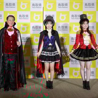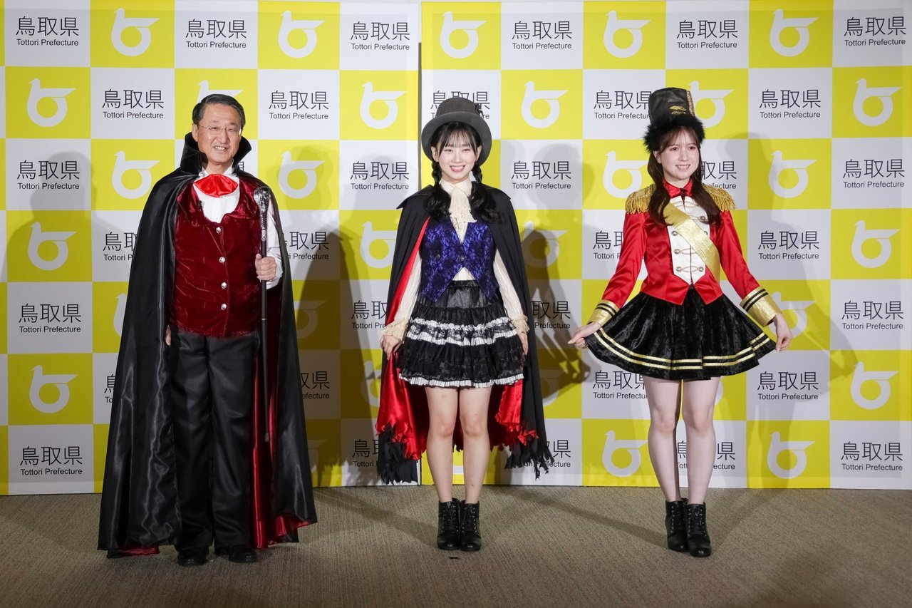 平井知事は自ら“サキュウ血鬼 ドサキュラ”のコスチュームで登場。本格的な仮装とポーズに会場は一気に温かな笑いに包まれた。平井知事は“鳥取県は妖怪のふるさとで、10月25日(土)には水木しげるロードでハロウィンイベントが開催されます。ほかにもフラワーパークとっとり花回廊や鳥取のまちなかなど、「ドサキュラのふるさと」である鳥取県のいたるところでもハロウィンを盛り上げるイベントを行ないます!”と鳥取県はハロウィンの聖地であることをアピール。また、特に西日本では万博ロスになっている 人が多いと話しつつ“本日はAKB48のおふたりを大使に任命させていただきますが、私たちはABK39(アフター万博サキュウ)で盛り上げたいと思います。鳥取砂丘ハロウィンパーティーへサッキュウ(=砂丘)にお越しください”と会場の笑いを誘った。