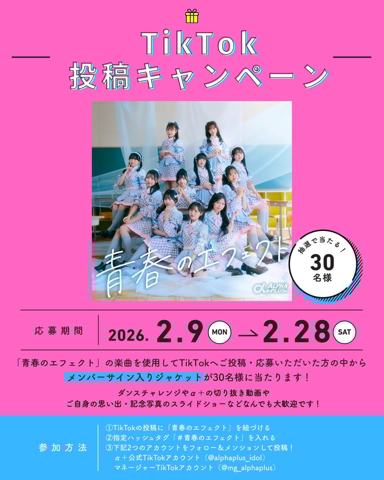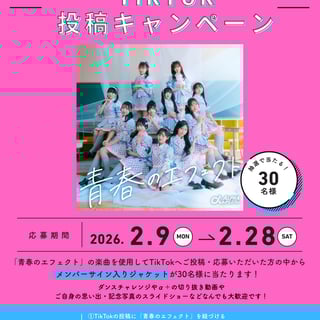 「青春のエフェクト」の楽曲を使用して、TikTokへご投稿・応募いただいた方の中から抽選で30名さまに、メンバーサイン入りジャケットをプレゼントいたします。