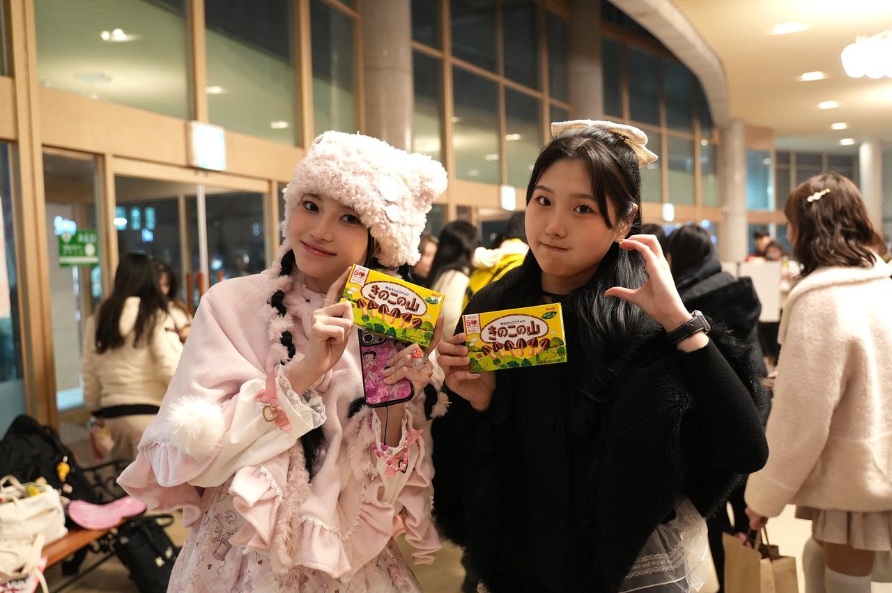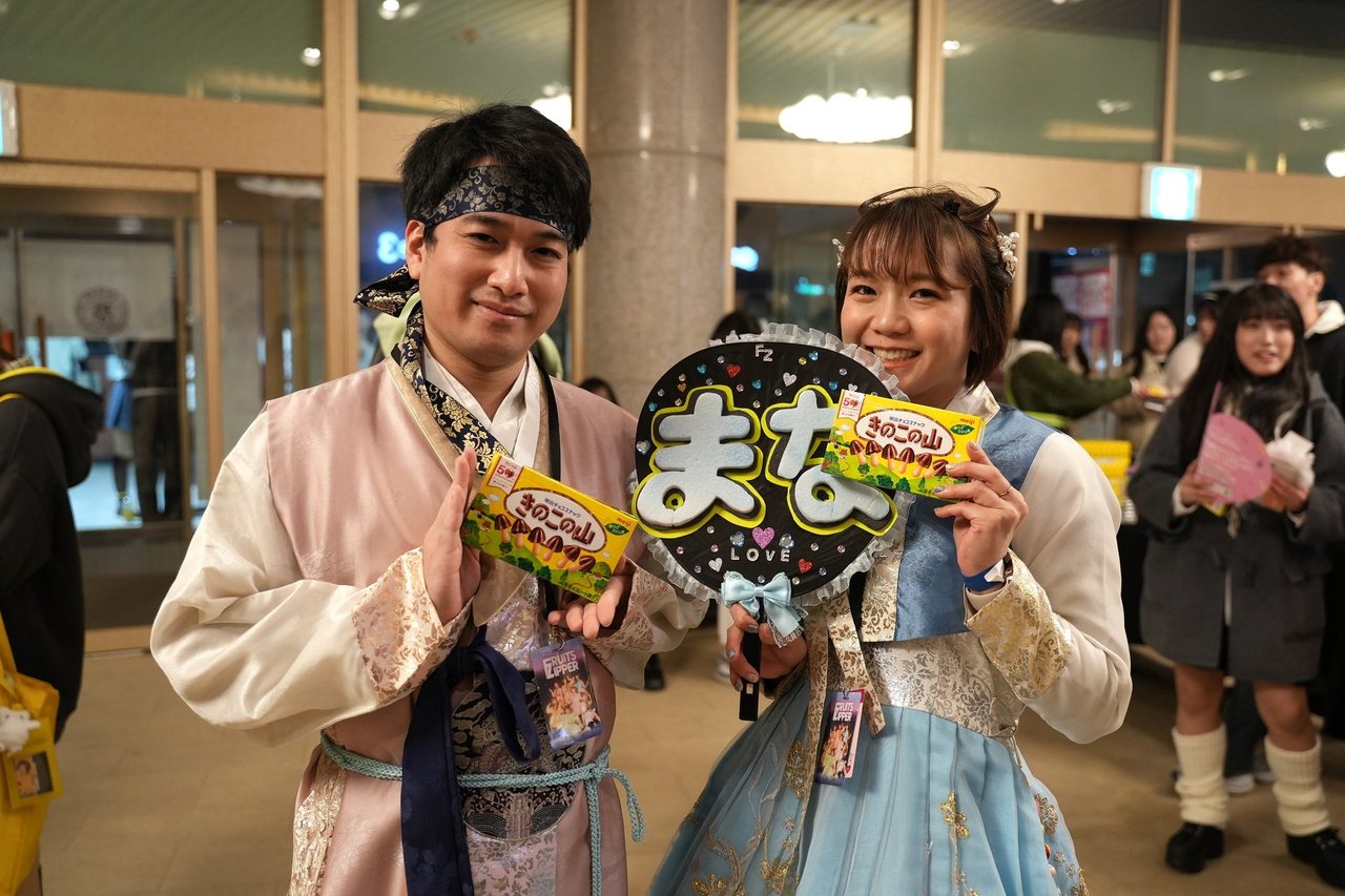 鎮西寿々歌は、“私はきのこの山派です!!! なのでソウル公演で大好きなきのこの山をみんなにお渡しできて、とっても嬉しかったです♡ みんながきのこの山を持って写真を撮ったり笑顔になってくれる姿を見て、私も幸せな気持ちになりました。でもここだけの話、きのこの山もたけのこの里もどっちも美味しいんですよね……!!! 私は昔たけのこの里派だったんです。でも大人になるにつれてきのこの山派になりました。でも、またたけのこの里派になるかもしれない。人生は長い! マシッソヨ〜! きのこの山〜!”と述べた。