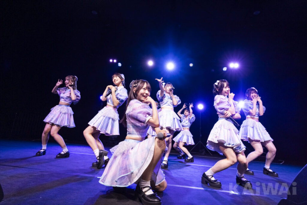 「完全燃焼サマーガール」では、ユニゾンで叫ぶように歌い、“最高の青春を取り戻しましょう!”と自分たちのコンセプトを語って始まった「アオゾラブ」では、今度は伸びやかな歌声を披露。その表情ははつらつと楽しそうで、前半はやはり緊張していたのだろう。最後は手をつないで一列になり、笑顔でジャンプを決めた。