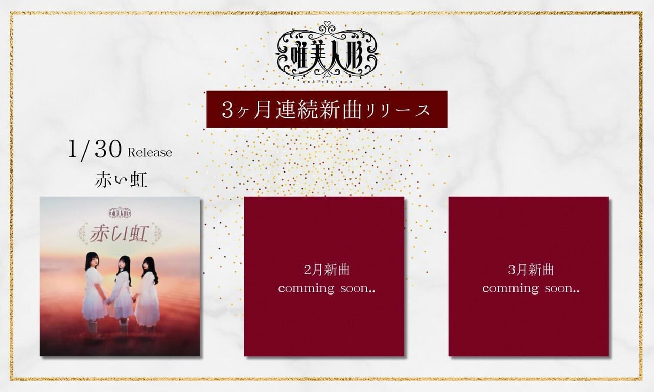 “耽美な世界で生きるお人形”をコンセプトに活動する3人組アイドルユニット・唯美人形が、3ヵ月連続リリースの幕開けとなる第1弾シングル「赤い虹」を1月30日(金)に配信スタートした。