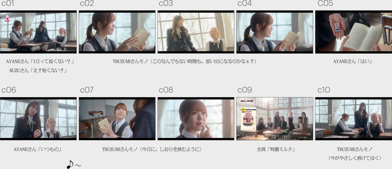 舞台は放課後の教室。制服姿のME:Iのメンバーたちが3組に分かれ、たわいもない会話をしたり、進路に悩んだり、各々放課後を過ごしている。「特濃メイト 特濃ミルク」篇では、窓際でおしゃべりをしているAYANE、SUZUと、隣の席で読書をするTSUZUMIが登場。“1日って長くない?”というAYANEさんの問いかけに、すかさず“え? 短くない?”と返すSUZU。正反対の回答に2人で笑い合う。その様子を見たTSUZUMIは“このなんでもない時間も、想い出になるのかなぁ?”と心の中で呟き、微笑む。すると、AYANEから“はい! いつもの”と『特濃ミルク』を差し出されたTSUZUMI。“今日にしおりを挟むように”と読んでいた本を閉じ、晴れやかな表情で2人を見上げる。最後は3人で向かい合い、屈託のない笑顔でおしゃべりをするのだった。