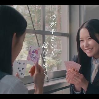 「特濃メイト もも」篇では、トランプで遊ぶMIUとMOMONAが登場。MIUが“そろそろ帰るか〜”と口にすると、“え、もう?”とMOMONAはまだ帰りたくない様子。MOMONAは“大人になると、1日が短く感じるらしい。だから、せめてもの抵抗をするのです”と、まるでカードを出すように『特濃ミルク8.2 もも』を取り出して、机の上にそっと差し出す。すると、それを受け取ったMIUも“延長線ですね”と微笑んで応じ、『特濃ミルク8.2 もも』を食べながら、引き続きトランプを楽しむ2人だった。