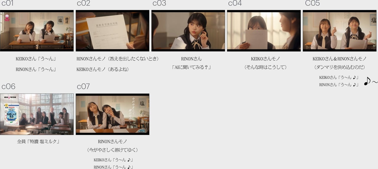 「特濃メイト 塩ミルク」篇は、白紙の進路希望調査用紙を前に、KEIKOとRINONが“う〜ん……”と頭を悩ませているシーンから始まる。悩んだ末、RINONが“AIに聞いてみる?”とおどけて見せると、KEIKOもいたずらっぽく微笑みながら“そんな時はこうして……”と応じる。“ダンマリを決め込むのだ!”という言葉を合図に2人揃って『特濃ミルク8.2 塩ミルク』を口へ運ぶ。すると、その濃厚な味わいに、思わず“う〜ん♪”と声を漏らし、至福の表情を浮かべる2人。いつの間にか悩みの“う〜ん……”が美味しさの“う〜ん♪”に変化し、『特濃ミルク8.2 塩ミルク』の味わいに浸っているのだった。