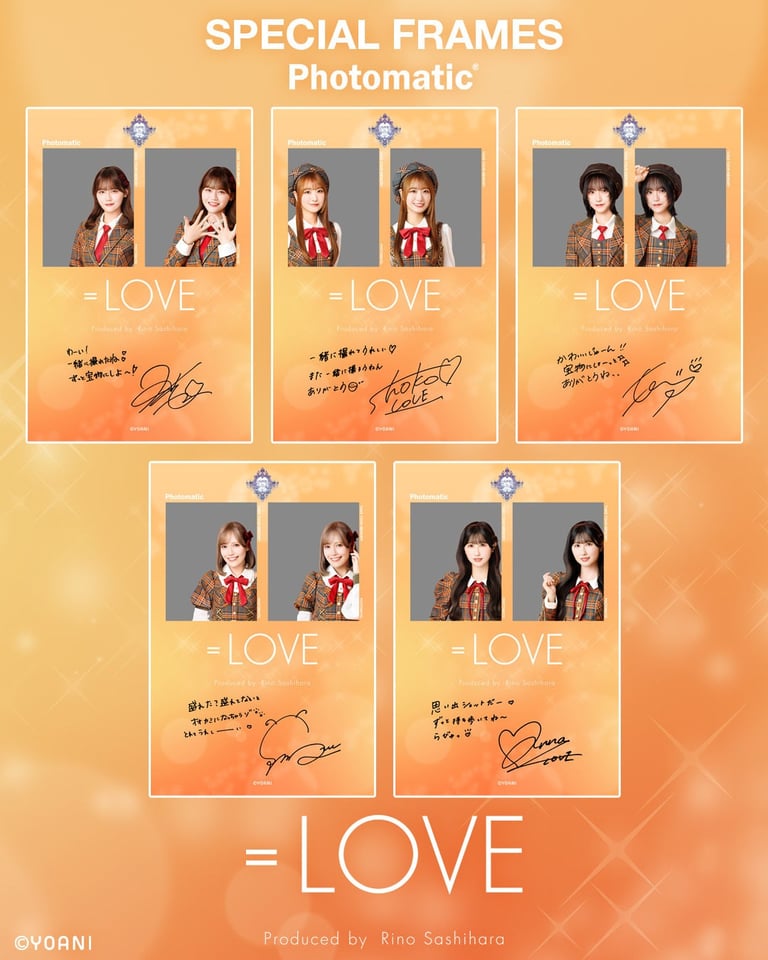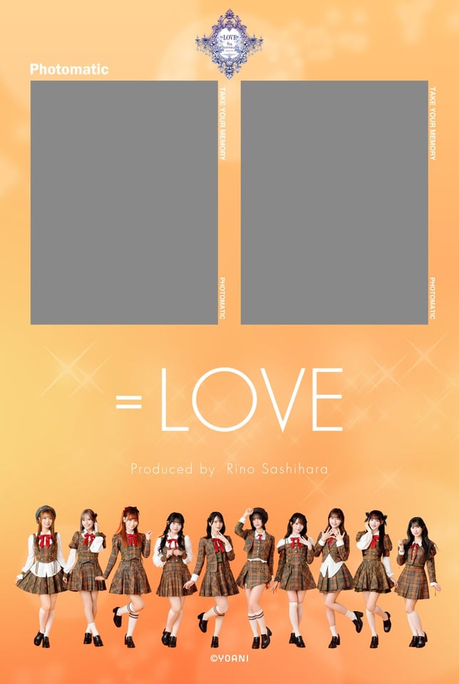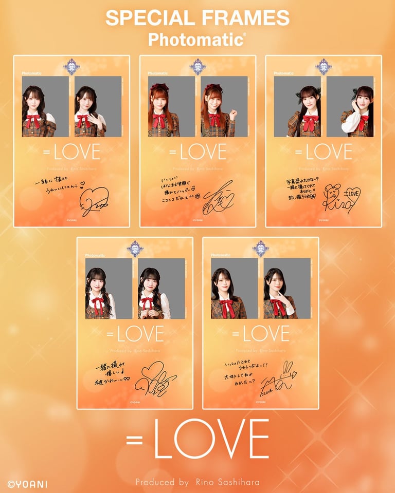 今回は=LOVE 19thシングル「ラブソングに襲われる」歌唱衣装に身を包んだメンバーとツーショット風の撮影ができるコラボレーションフレームが登場。フレームにはメンバーそれぞれの手書きメッセージもデザインされている。ほかにも、特定店舗でPhotomaticの写真を挟めるオリジナル台紙のプレゼントキャンペーンも実施。
