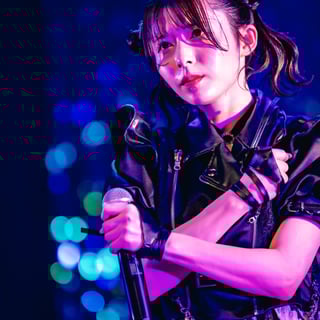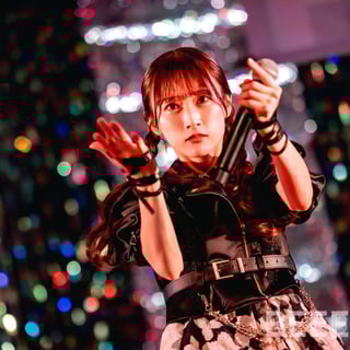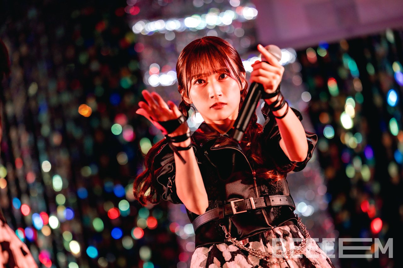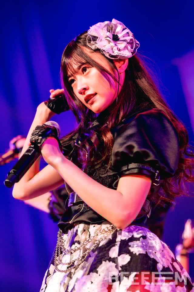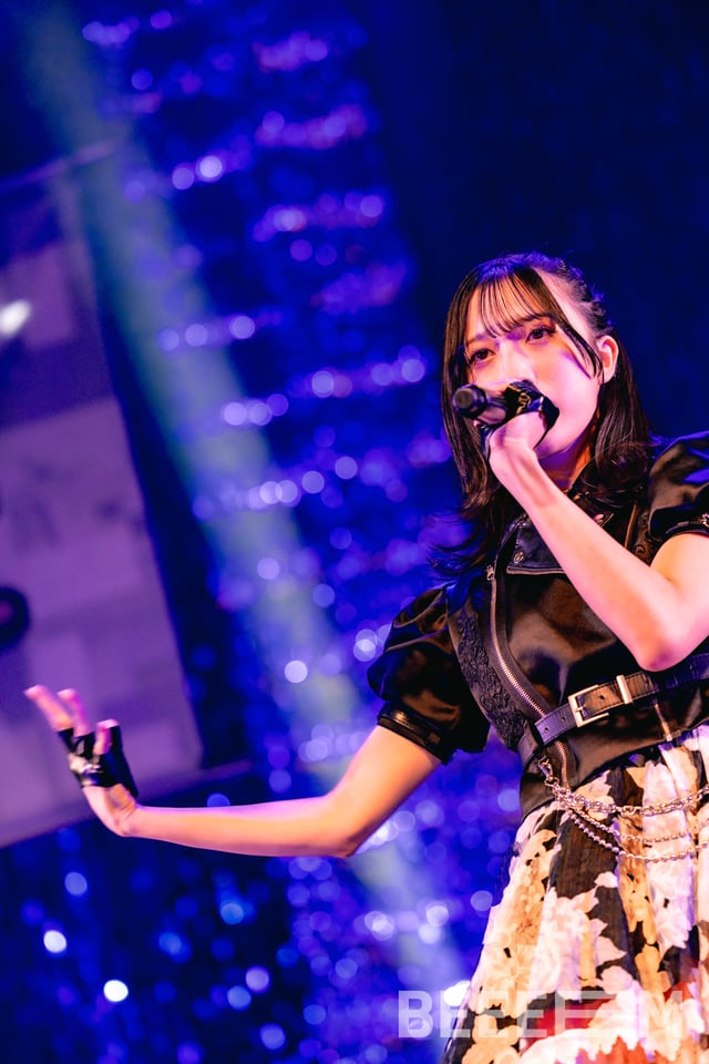 「We are IDOL」ではアイドルとしての決意を、拳を振り上げながら叫ぶように歌い上げる。もちろんその動きも切れ味鋭く激しい。間奏で音量が落ちる場面では、7人の動きも静かなものとなり、見事なコントラストを描き出す。静寂が生まれる中で、星野夢空が伸びやかに歌い出し、瀬乃が感情を込めて歌い継ぐ。なんともドラマティックな展開で会場を魅了すると、桃井美月が“○×△@……”と言葉にならない声を上げる。そして再び7人で拳を振り上げ、髪を振り乱して絶唱。観客も熱いコールで7人の熱演に応えた。