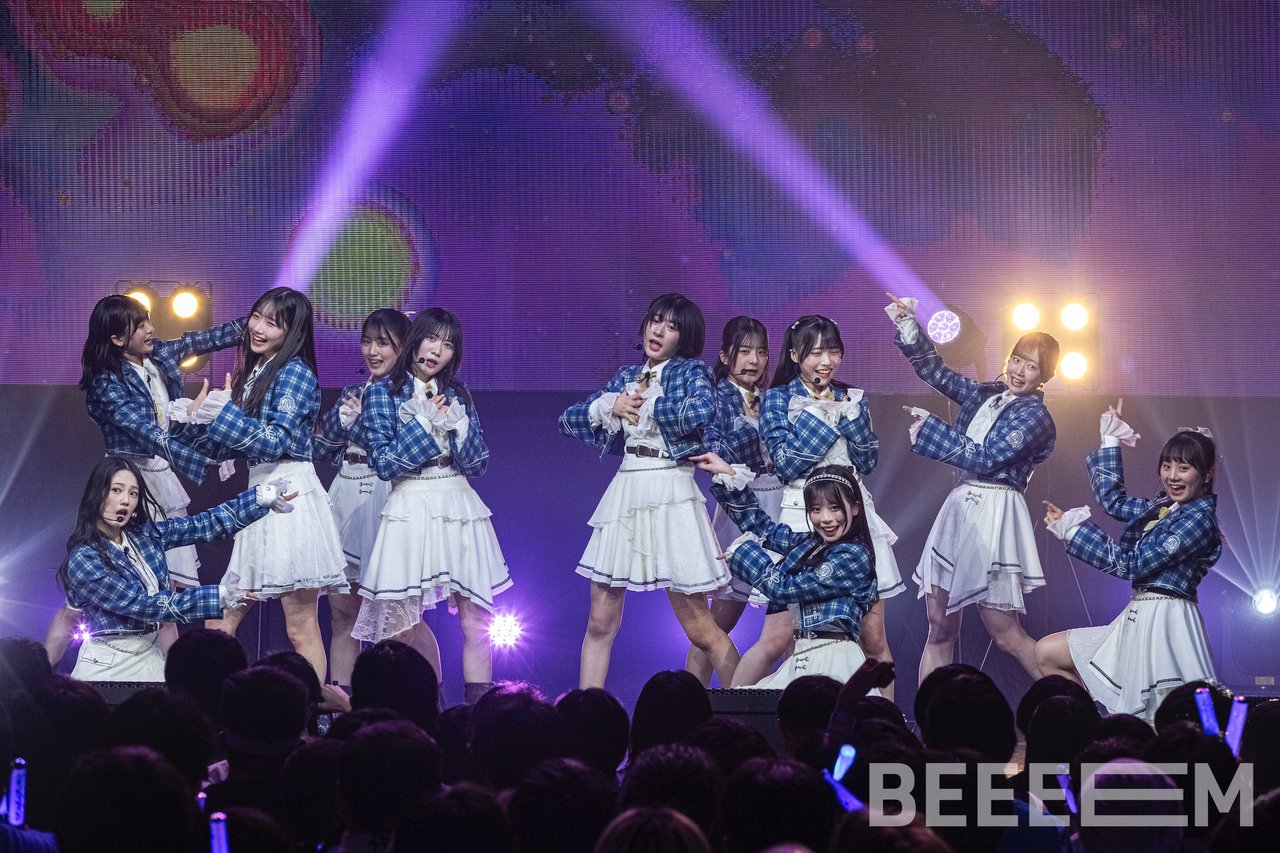 SEが流れ出し、青いペンライトがフロアを美しく彩り、大きなコールが沸き上がる中、『BEEEEM』vol.1に登場した杉浦英恋、塩釜菜那、八木仁愛をはじめ、岩本理瑚、金澤亜美、須永心海、西森杏弥、長谷川稀未、早﨑すずき、柳堀花怜、吉本此那がステージに登場。この11人(選抜メンバーの青空組)による僕が見たかった青空が初開催となる『BEEEEM FES』の幕開けを告げた。